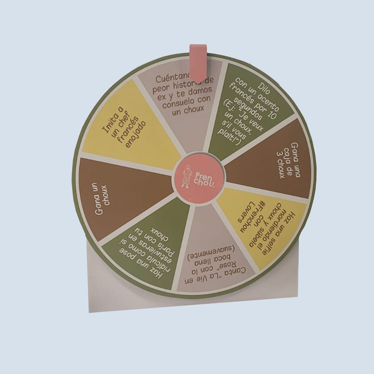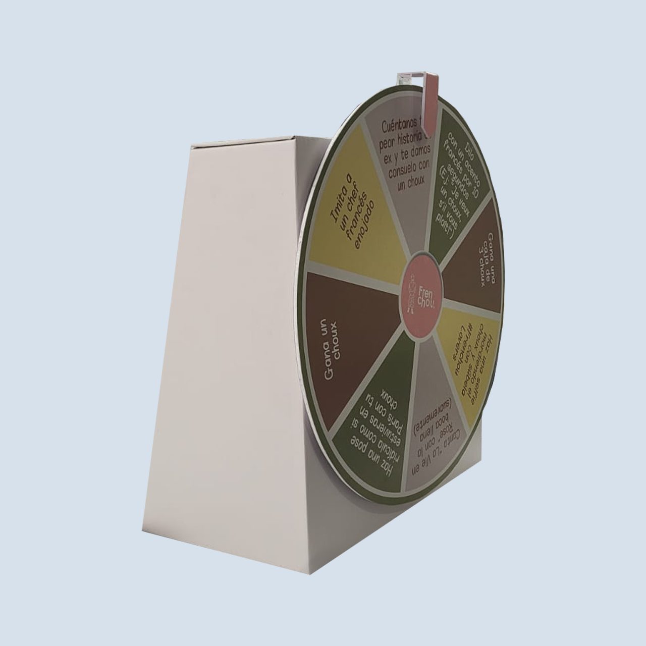Ruleta totalmente funcional y estable, hecha en cartón , perfecta para tener interacción con tu público e incentivar la compra.
